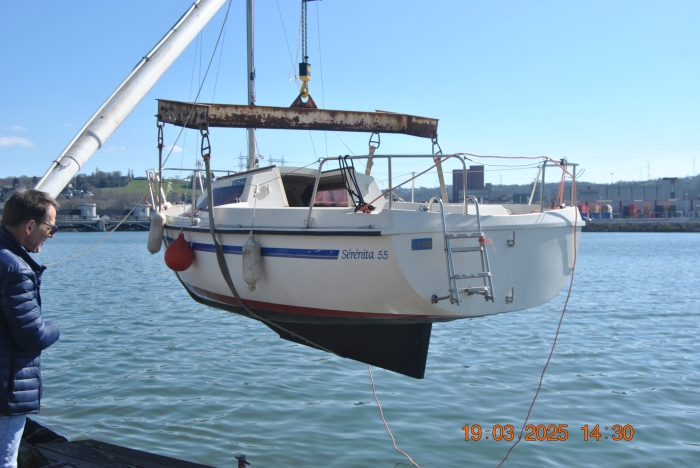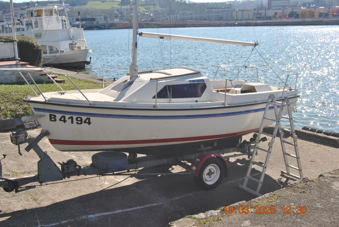 exellent état général (cause triple emploi) complet 3 voiles, ancre ,bouée,cordages etc moteur en puit 8cv 4 tps yamaha ou 5 cv 4 tps mercury entretien complet effectué (facture) remorque 1300kg ptc avec tous ses papiers sellerie état neuf gelcoat d'origine