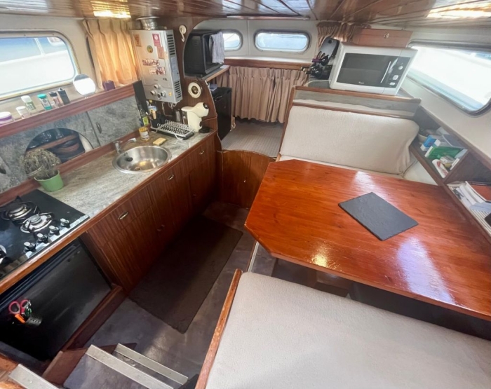Jolie Vedette Hollandaise de 1988 en très bon état, dimensions 10,50 m x 3,54 m, homologuée 6 personnes à bord, moteur Peugeot Indénor Turbo-diesel de 64 cv qui a seulement 3827 heures.