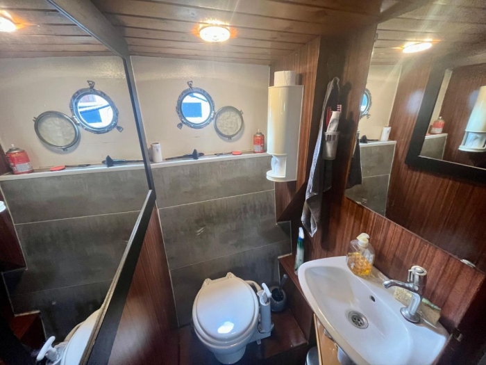 1 cabine avec 1 lit 2 places et 1 lit 1 place, 1 grand carré avec le salon et la timonerie, 1 cuisine, salle de bain avec douche et WC séparés, bien équipé :